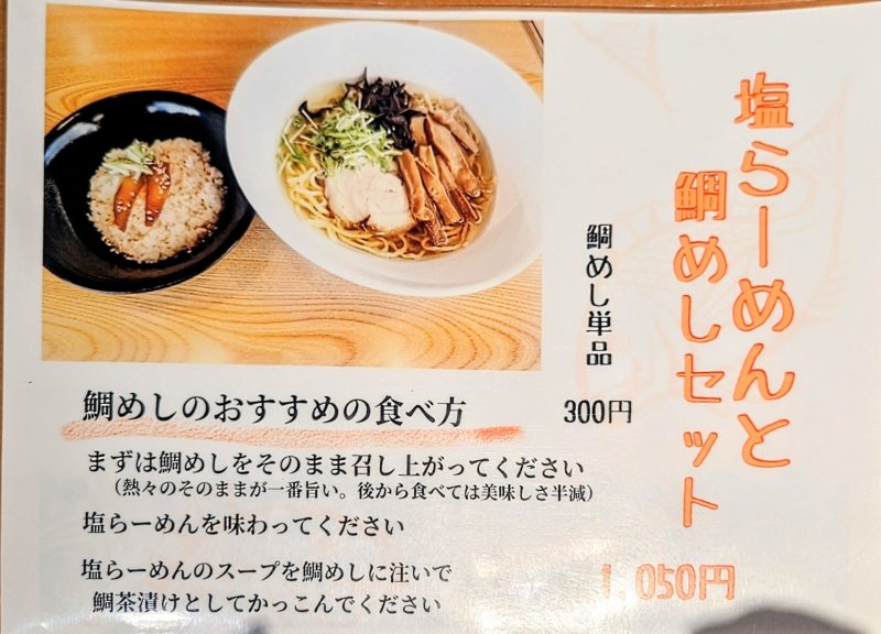 らーめんの場合は麺が細めで、スープもかなりあっさりしているようです。こちらの方が頼まれている鯛めしも人気の高いサイドメニューらしいですよ。塩ラーメンに合いそうなご飯メニューですね。